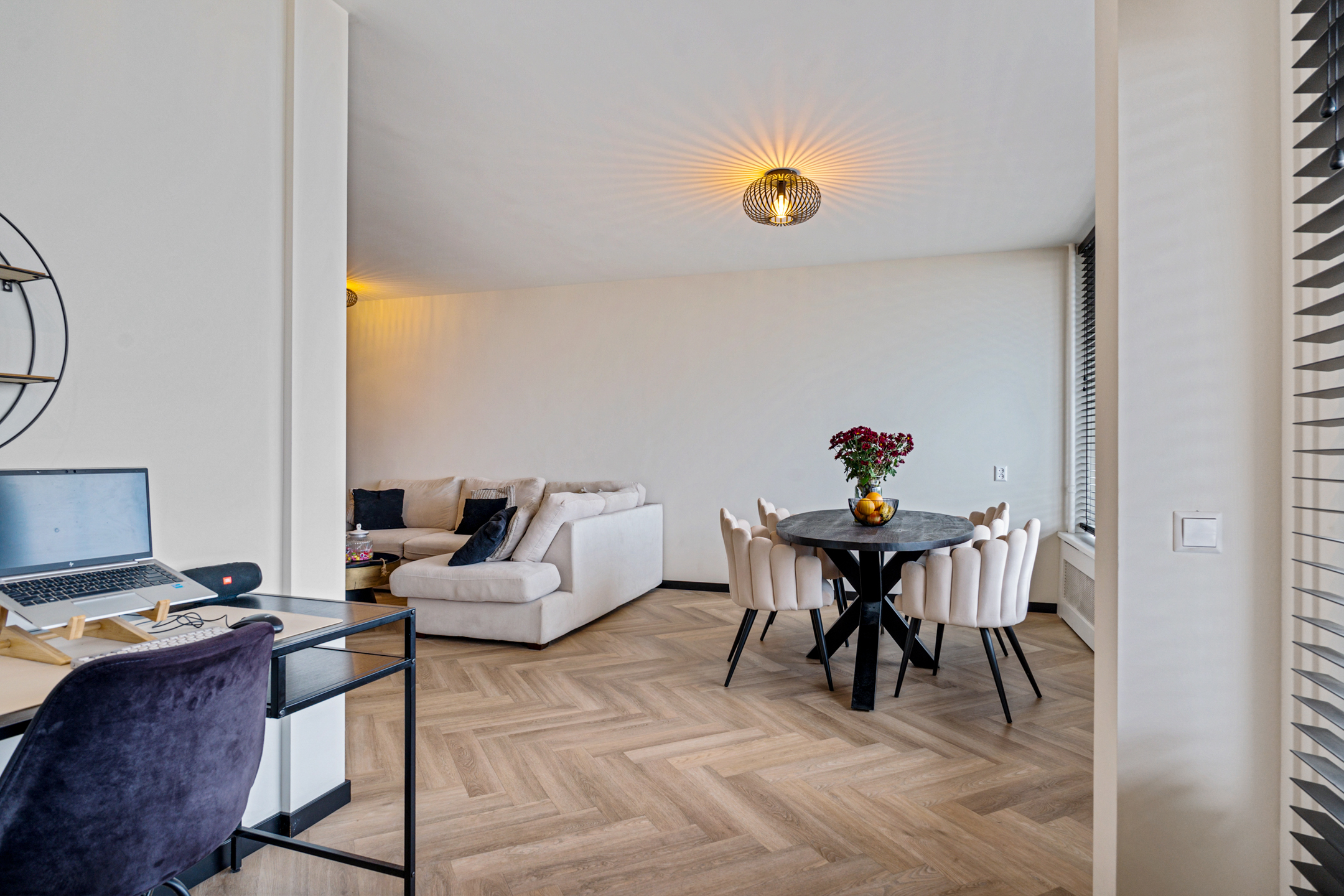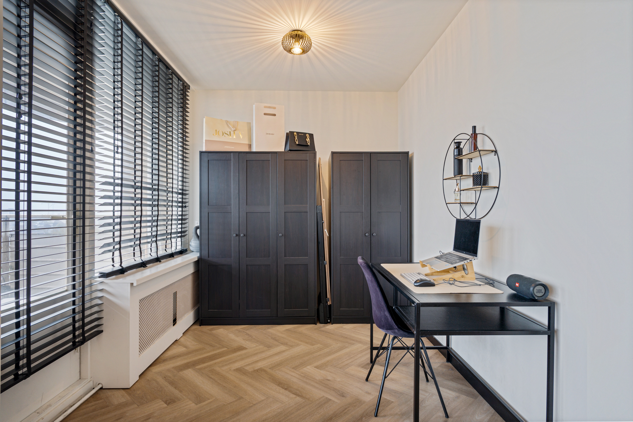 De woonkamer is heerlijk licht dankzij de grote raampartijen. Vanuit hier stap je zo het balkon op het oosten op, waar je ’s ochtends van de zon geniet en dankzij de hoekligging ook in de middag de zon nog kunt meepakken — mét uitzicht op de skyline van Zoetermeer. Aan de achterzijde bevindt zich een extra ruimte, momenteel in gebruik als kantoor of thuiswerkplek.
