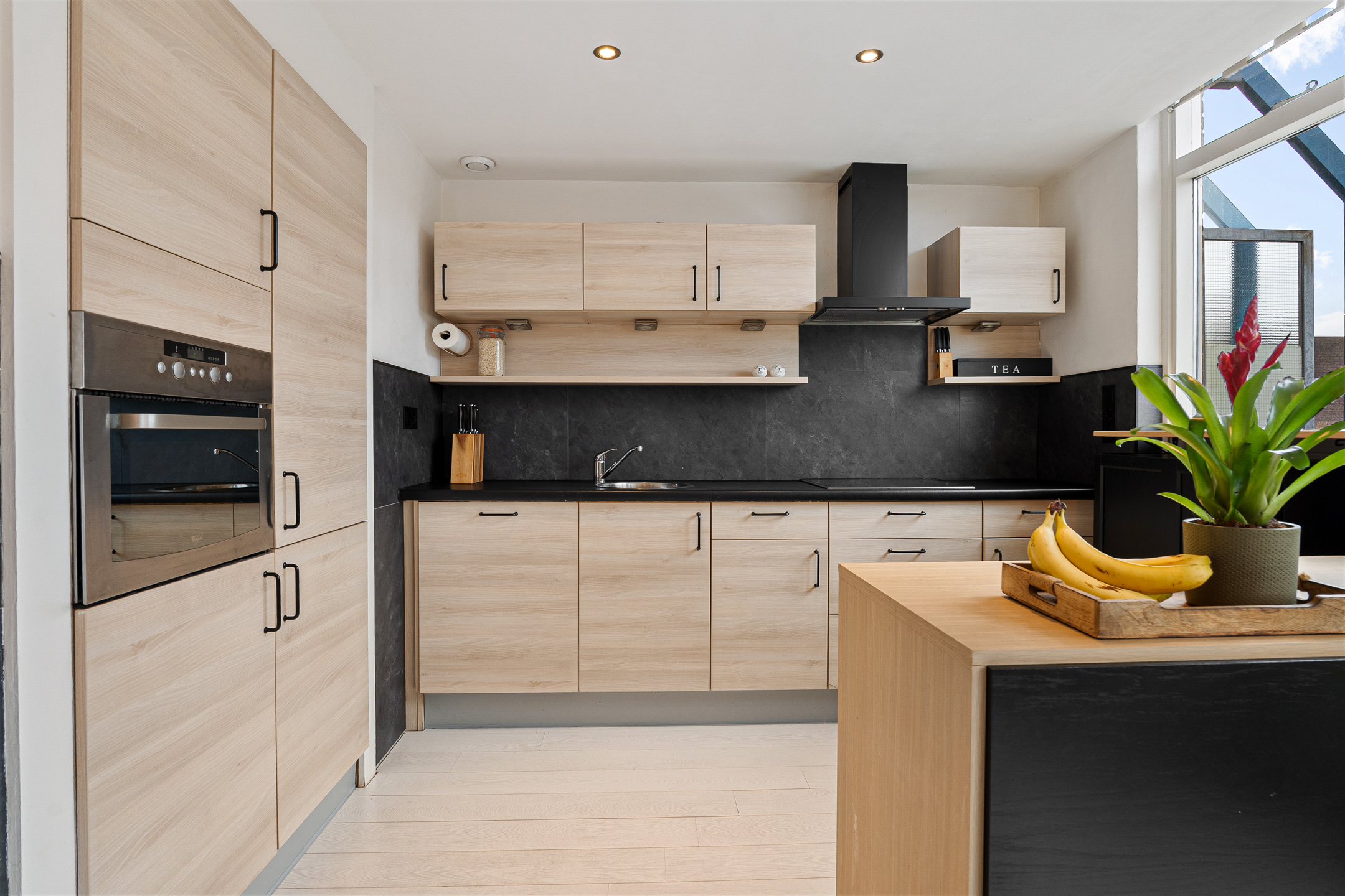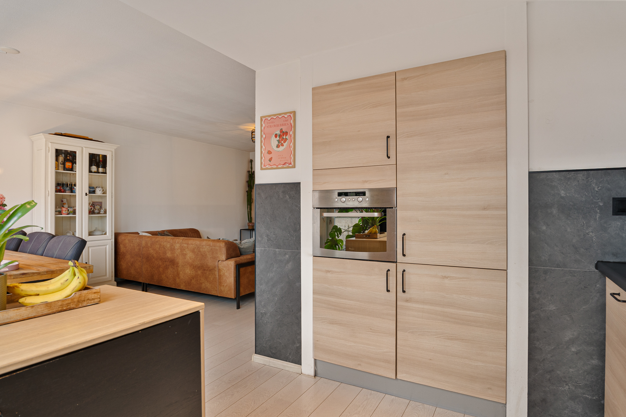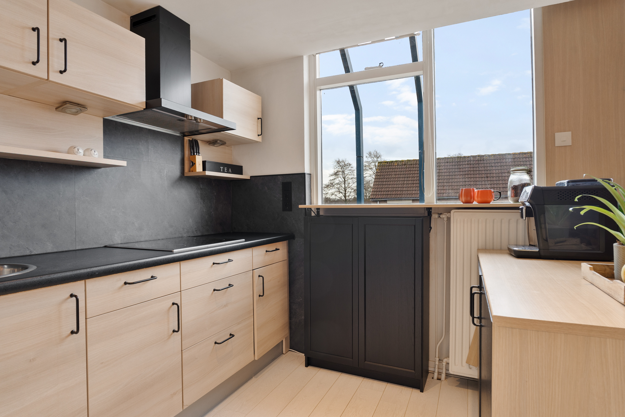 De woonkamer is heerlijk ruim en dankzij de grote raampartijen bijzonder licht. Vanuit hier heb je een vrij en prettig uitzicht. De open keuken sluit mooi aan op de leefruimte en is voorzien van een inductiekookplaat, afzuigkap, combi-oven, koel-vriescombinatie en voldoende kastruimte.