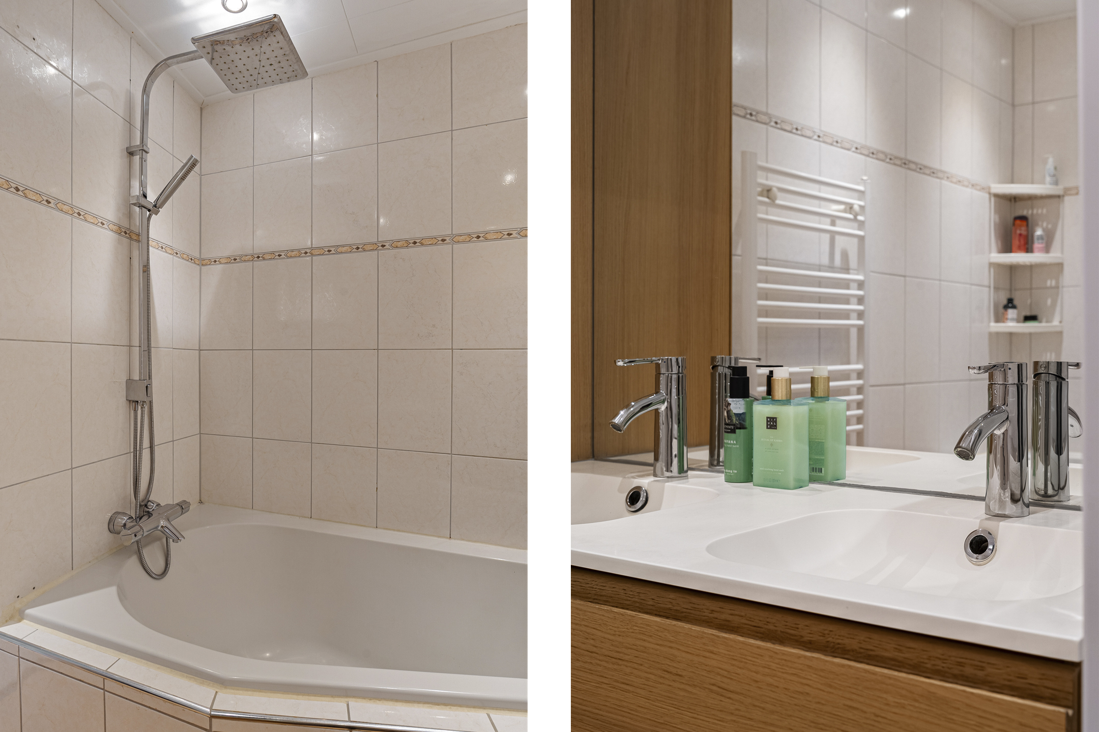 De badkamer is direct naast het toilet gelegen en ruim opgezet. De badkamer beschikt over een bad met douche (regendouche), een dubbele wastafel, handdoekradiator, spotjes, wasmachineaansluiting en genoeg ruimte voor een droger. Ook de badkamer is volledig betegeld.