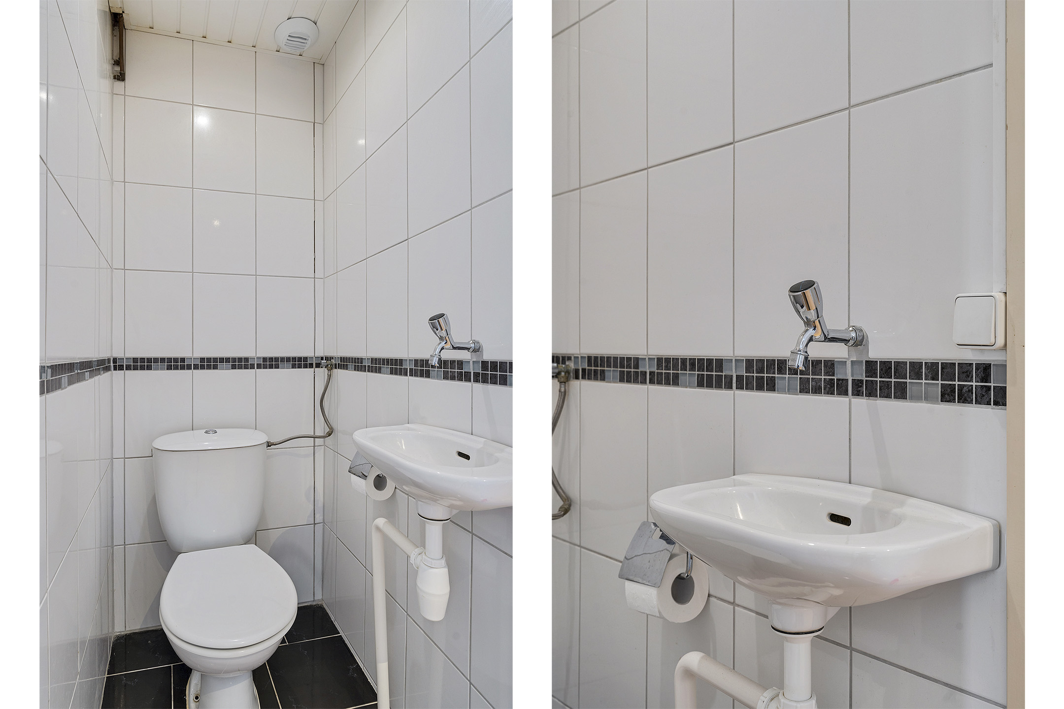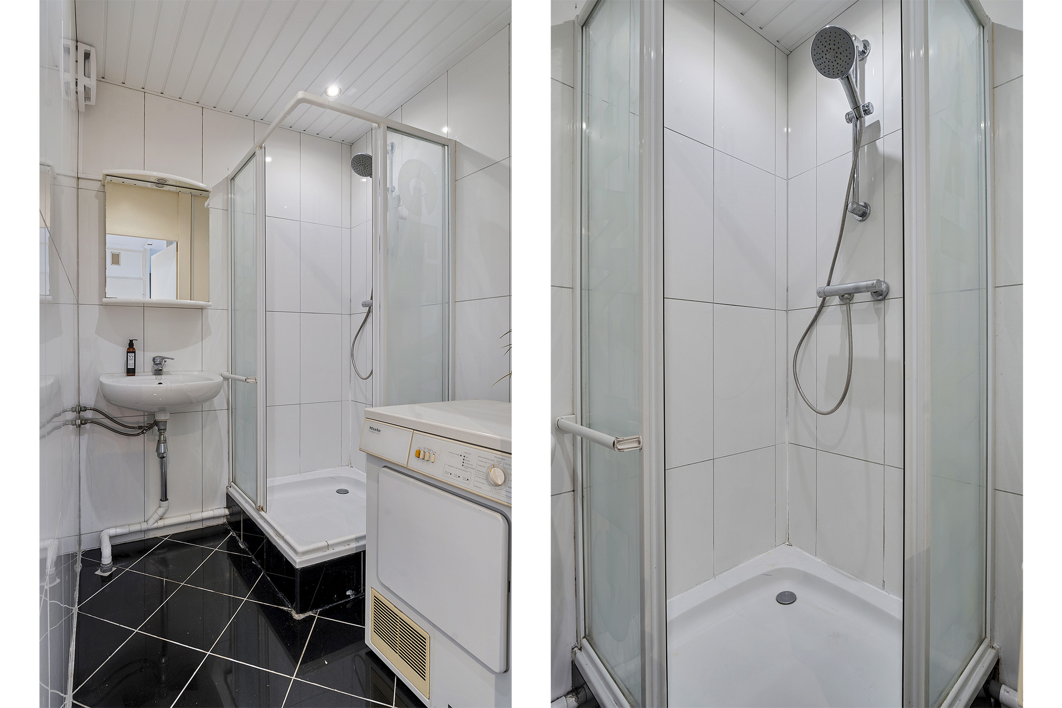 De badkamer beschikt over een douche en aansluitingen voor een wasmachine en droger. Daarnaast is er in de hal een separaat toilet te vinden.