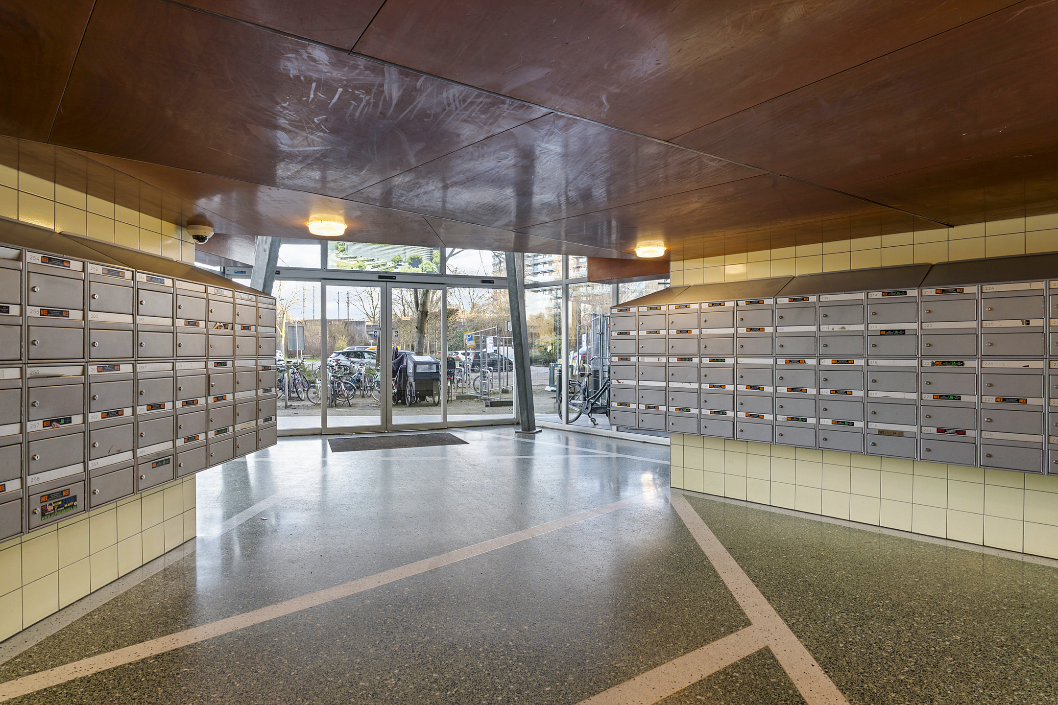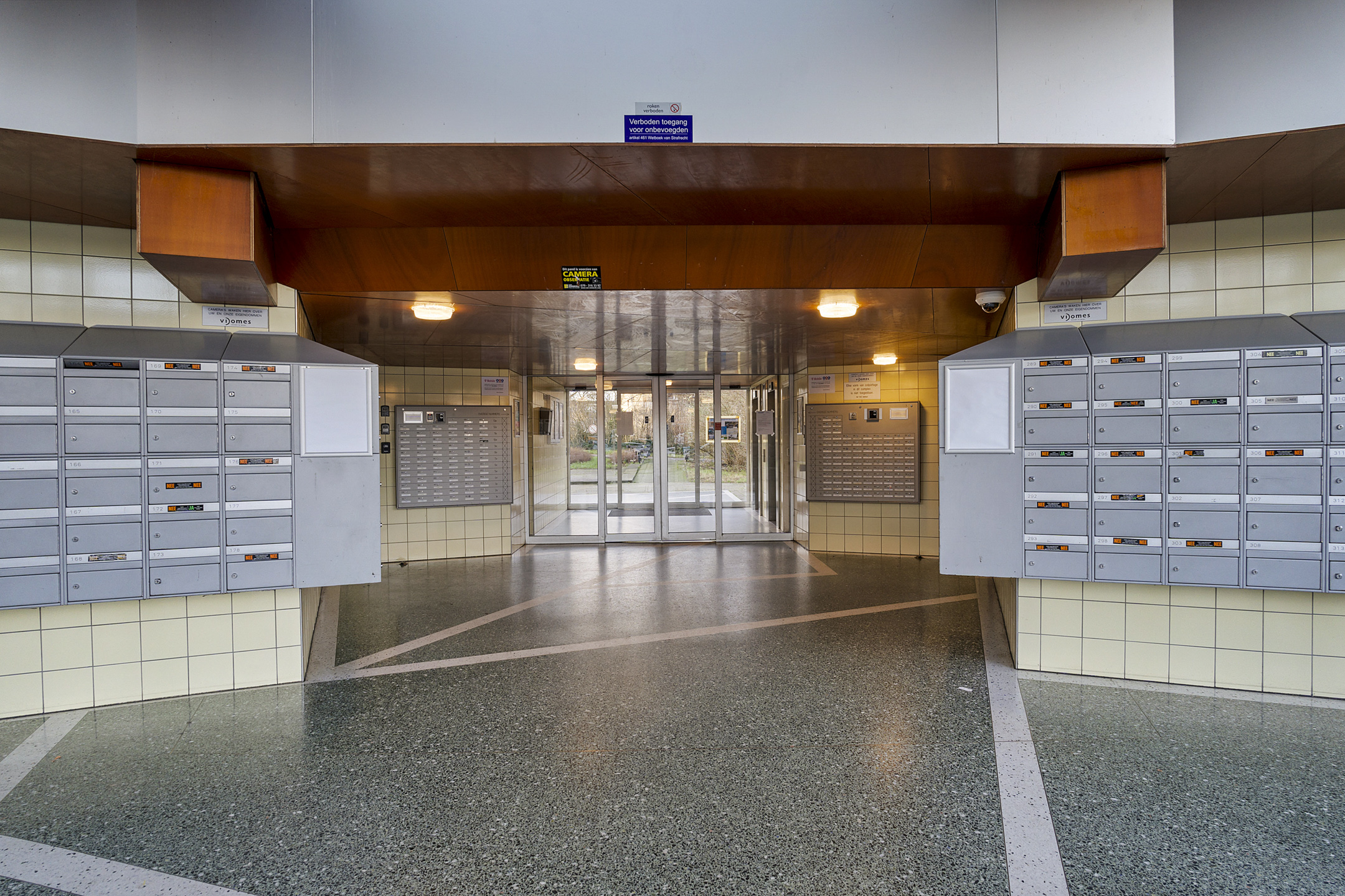 De gezamenlijke entree is netjes en modern, met elektronische schuifdeuren en een bellenbord, brievenbussentableau en intercominstallatie. Via een afgesloten entree bereik je de lift en het trappenhuis, die toegang geven tot de verschillende verdiepingen van het complex.