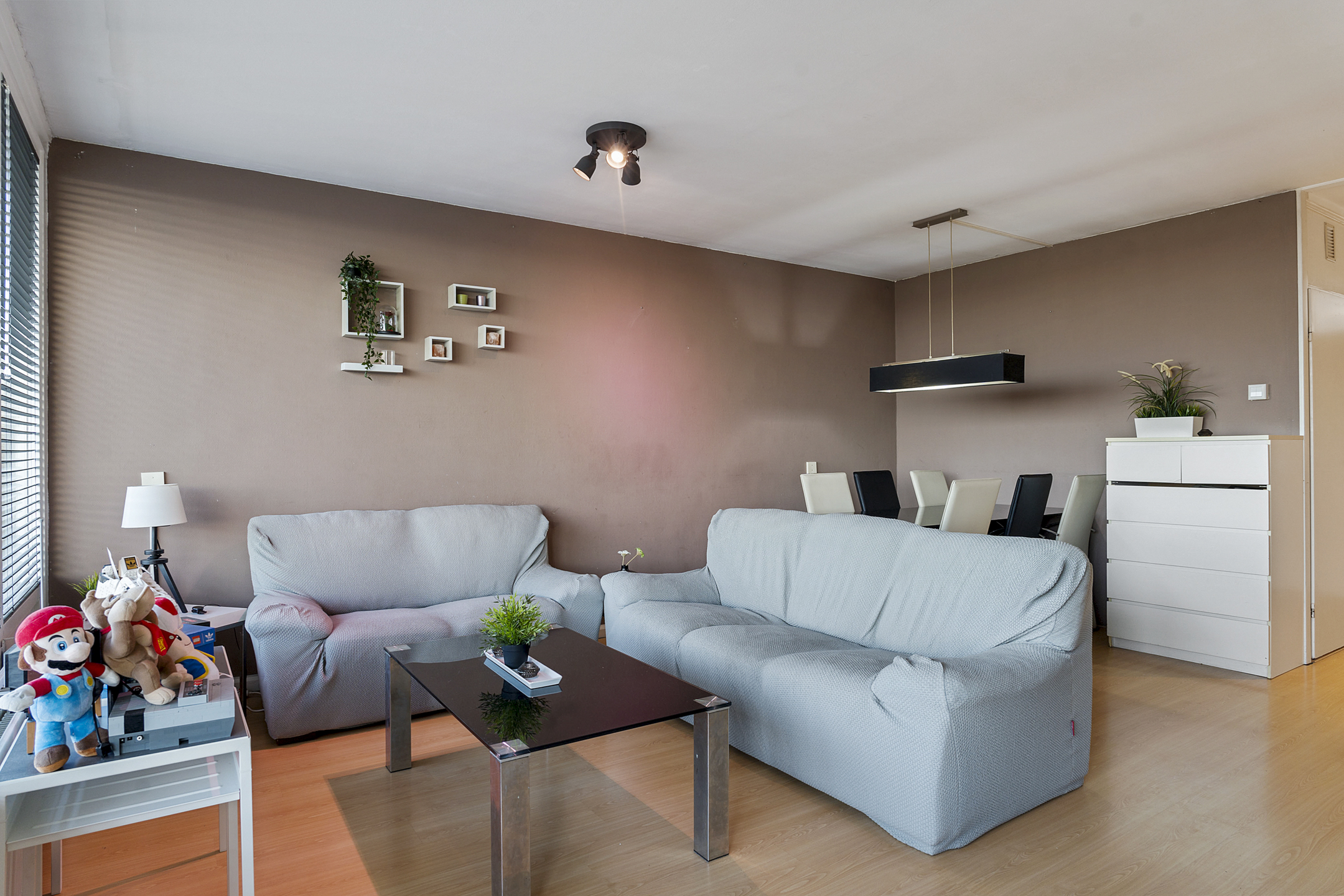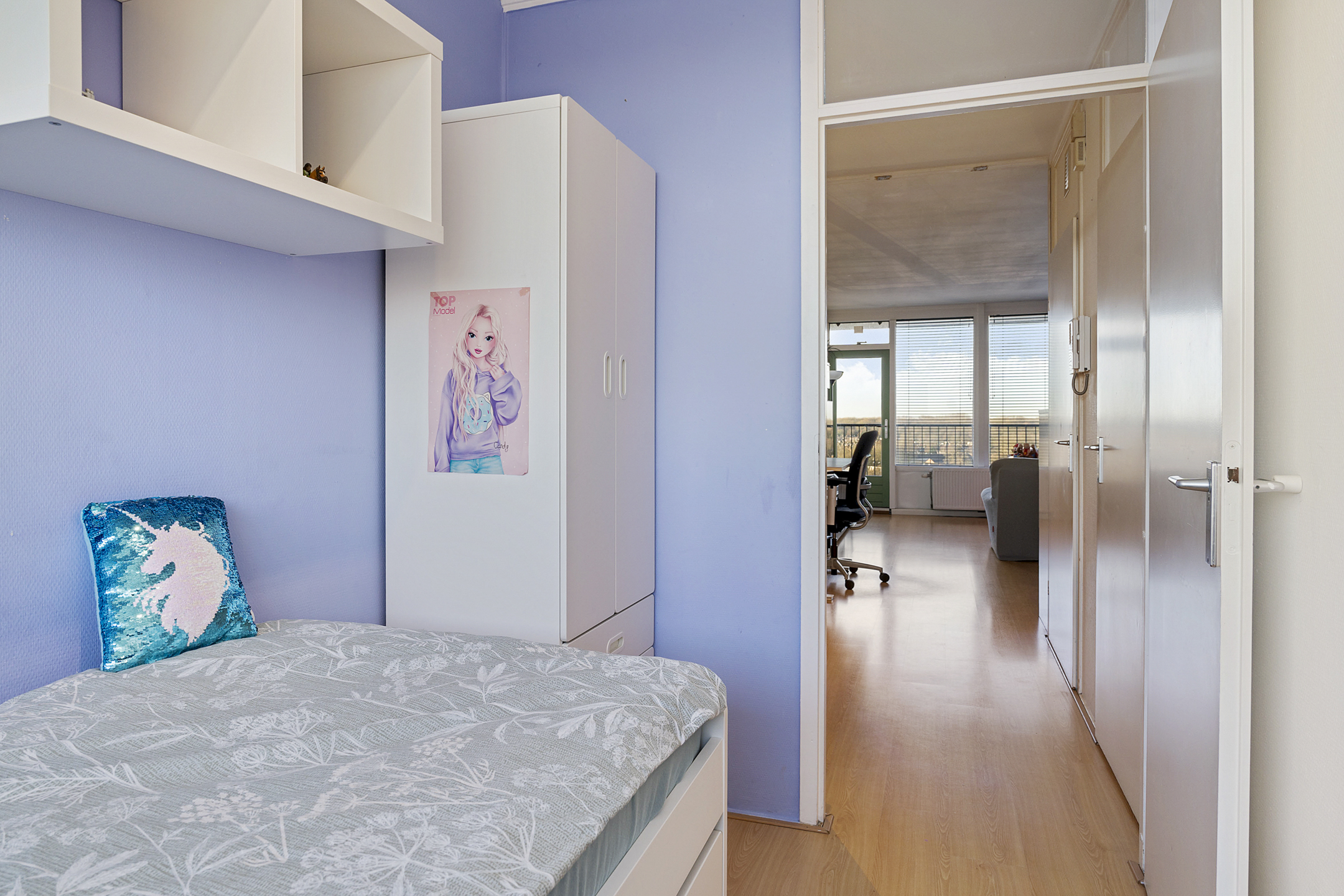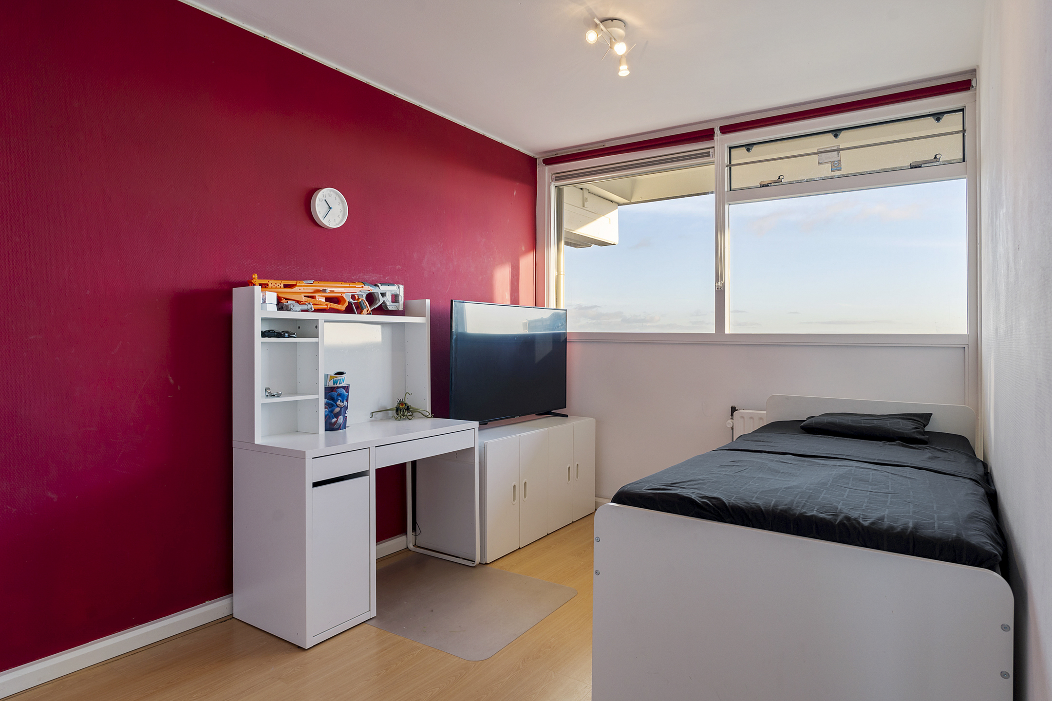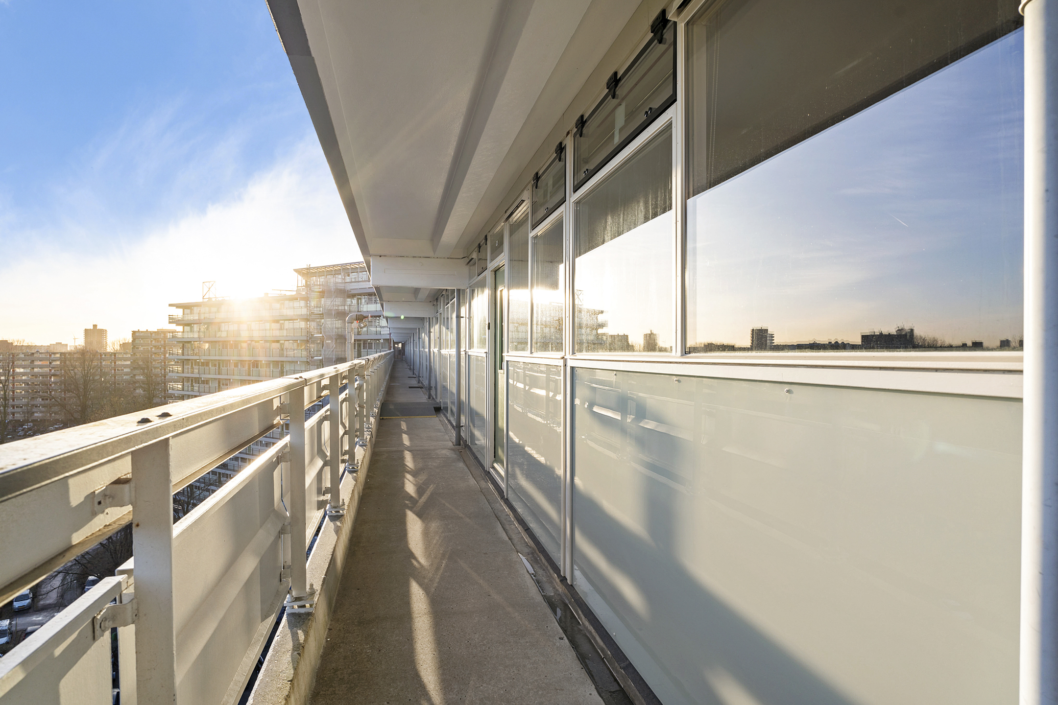 Aan de voorzijde van het appartement liggen twee slaapkamers, terwijl je aan de achterzijde de lichte woonkamer en een derde slaapkamer vindt. De ruime woonkamer heeft grote ramen die zorgen voor veel natuurlijk licht. Vanuit hier stap je zo het zonnige balkon op, gelegen op het zuidwesten, waar je kunt genieten van een weids uitzicht.