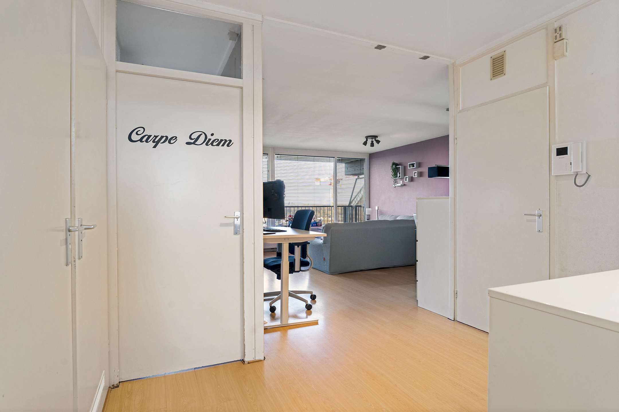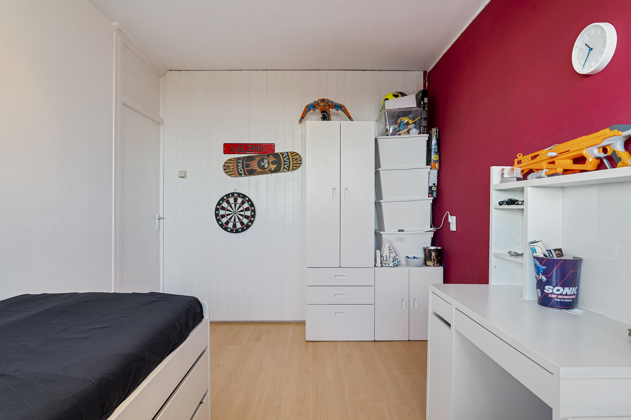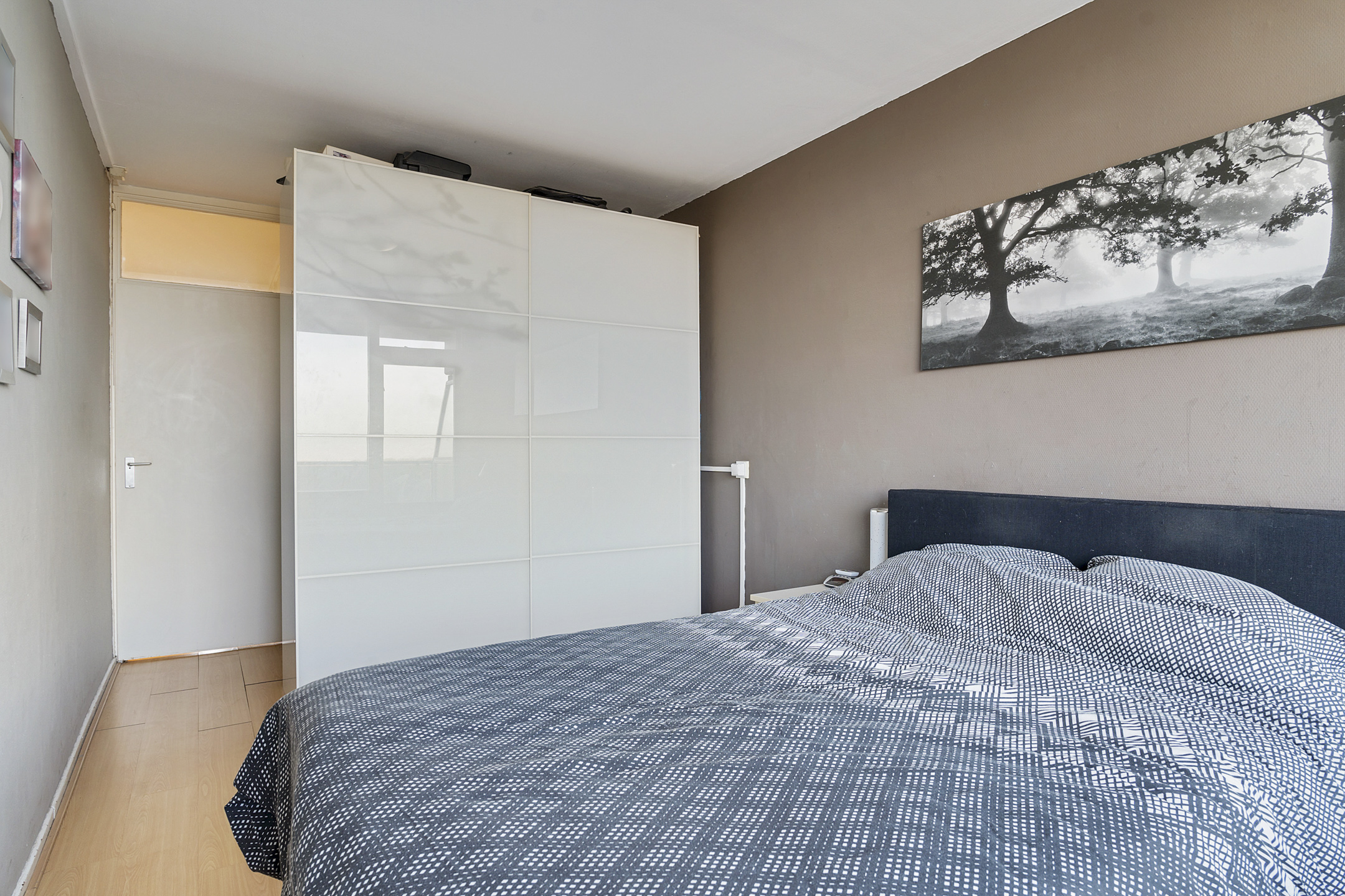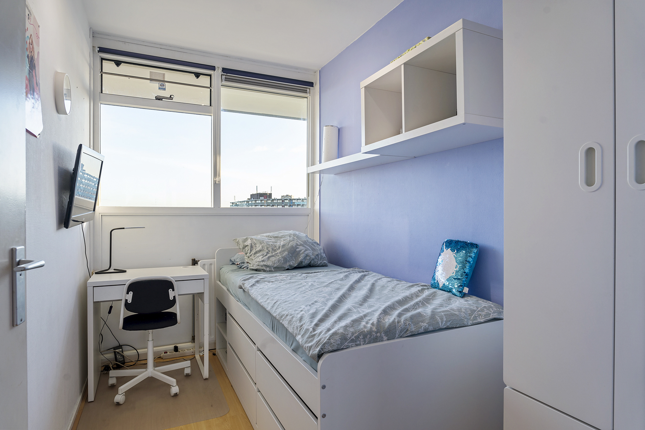 Aan de voorzijde van het appartement liggen twee slaapkamers, terwijl je aan de achterzijde de lichte woonkamer en een derde slaapkamer vindt. De ruime woonkamer heeft grote ramen die zorgen voor veel natuurlijk licht. Vanuit hier stap je zo het zonnige balkon op, gelegen op het zuidwesten, waar je kunt genieten van een weids uitzicht.