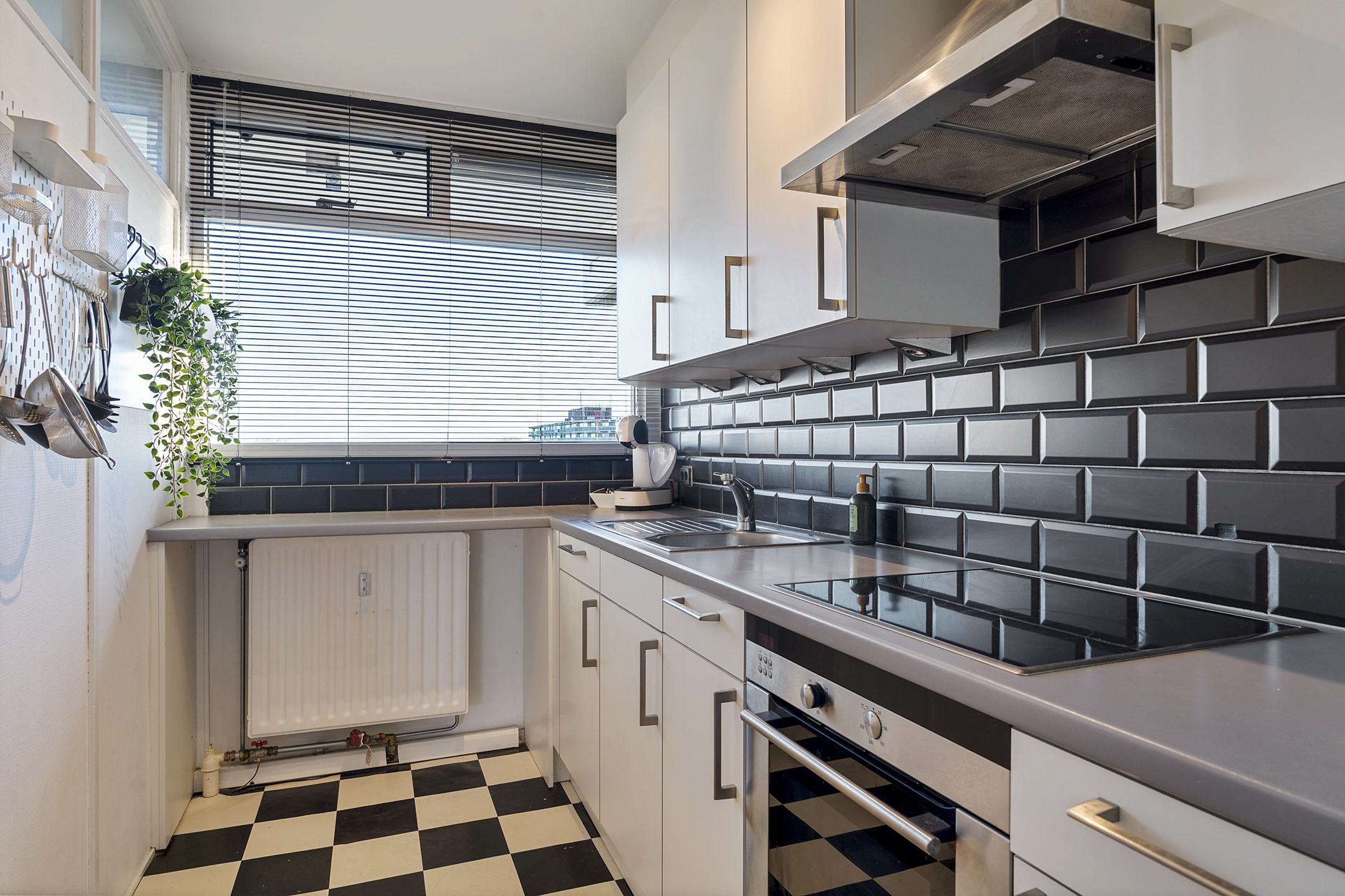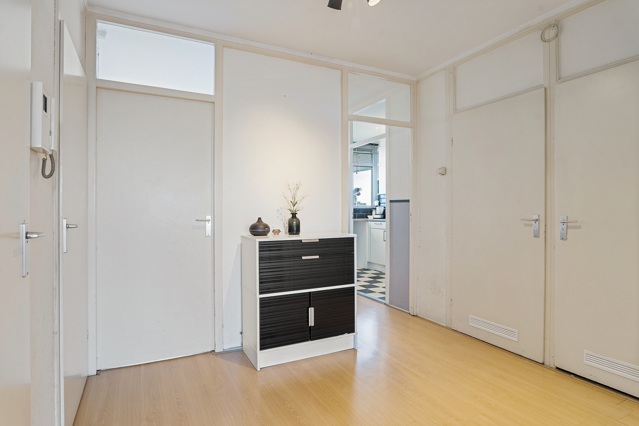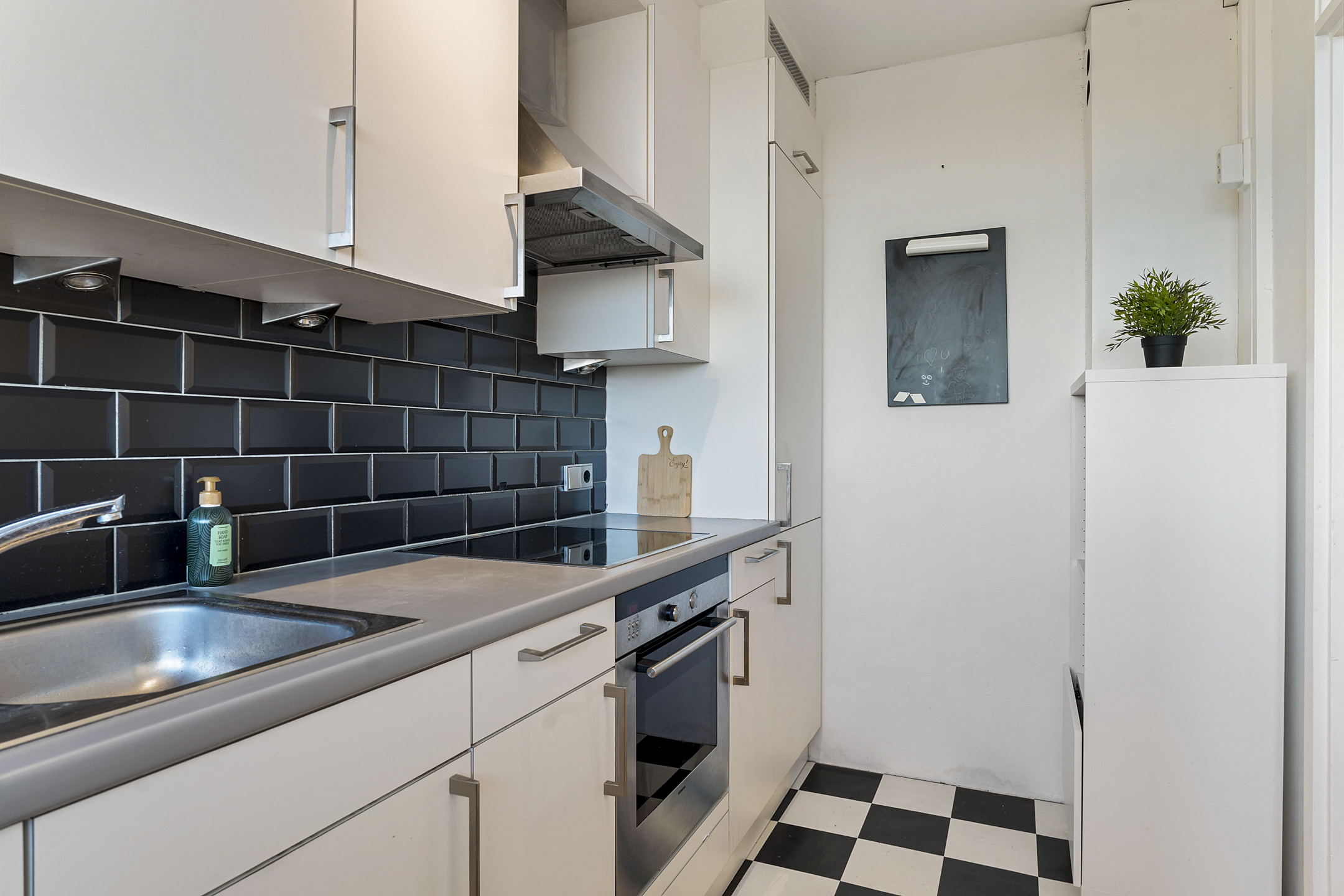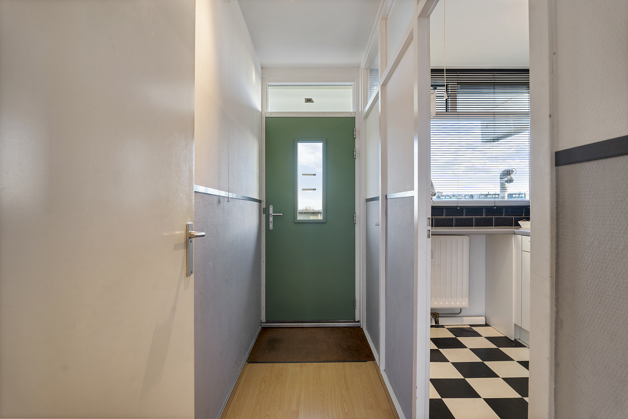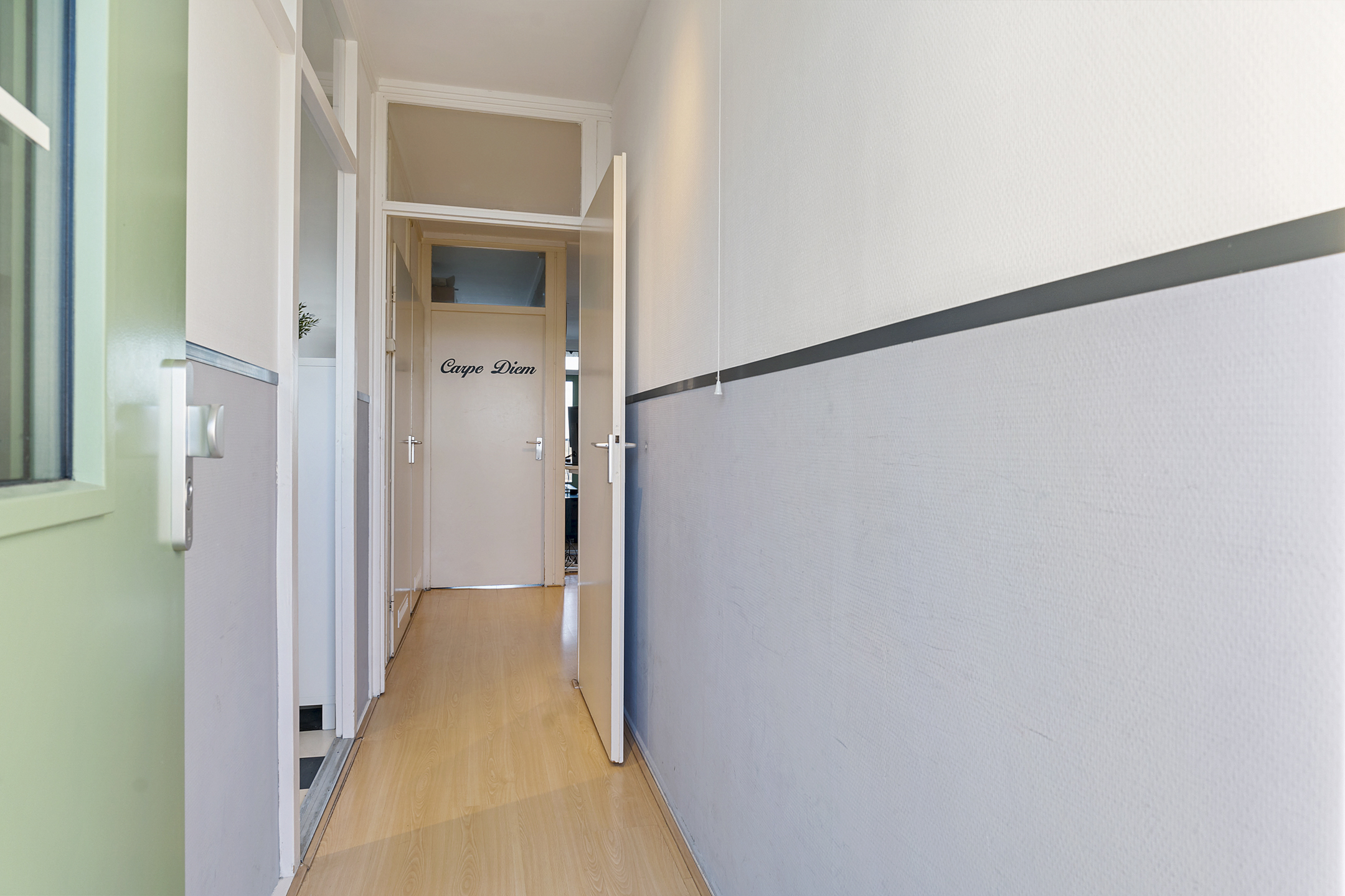 Bij binnenkomst in het appartement stap je eerst de gang in, die toegang geeft tot de keuken. Vanuit de gang bereik je de centrale hal, vanwaar je naar alle andere ruimtes kunt. De keuken is voorzien van diverse inbouwapparatuur, biedt voldoende opbergruimte en is praktisch ingericht.