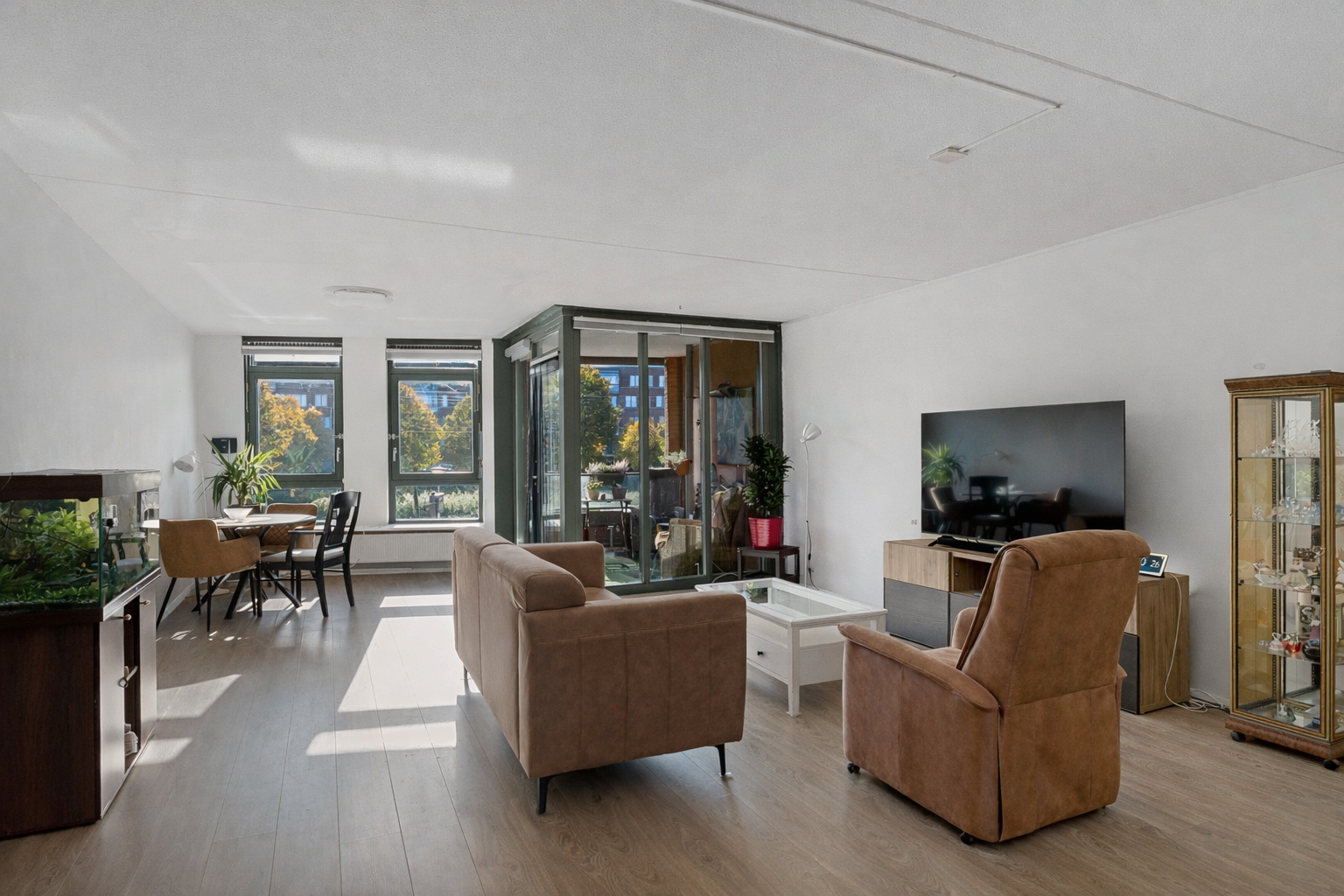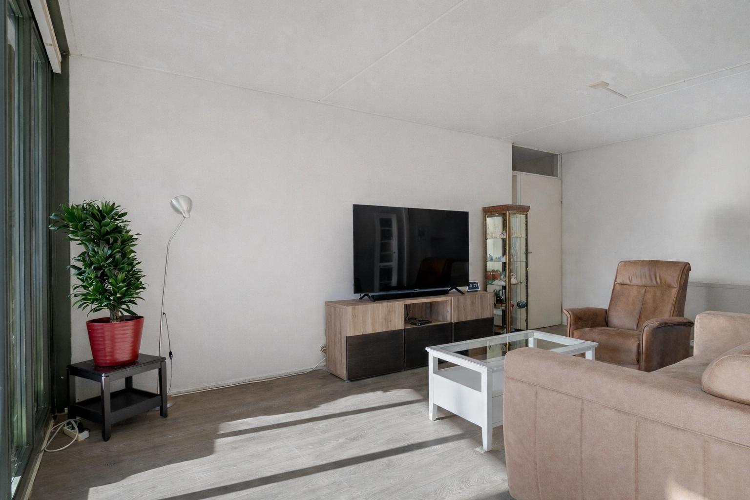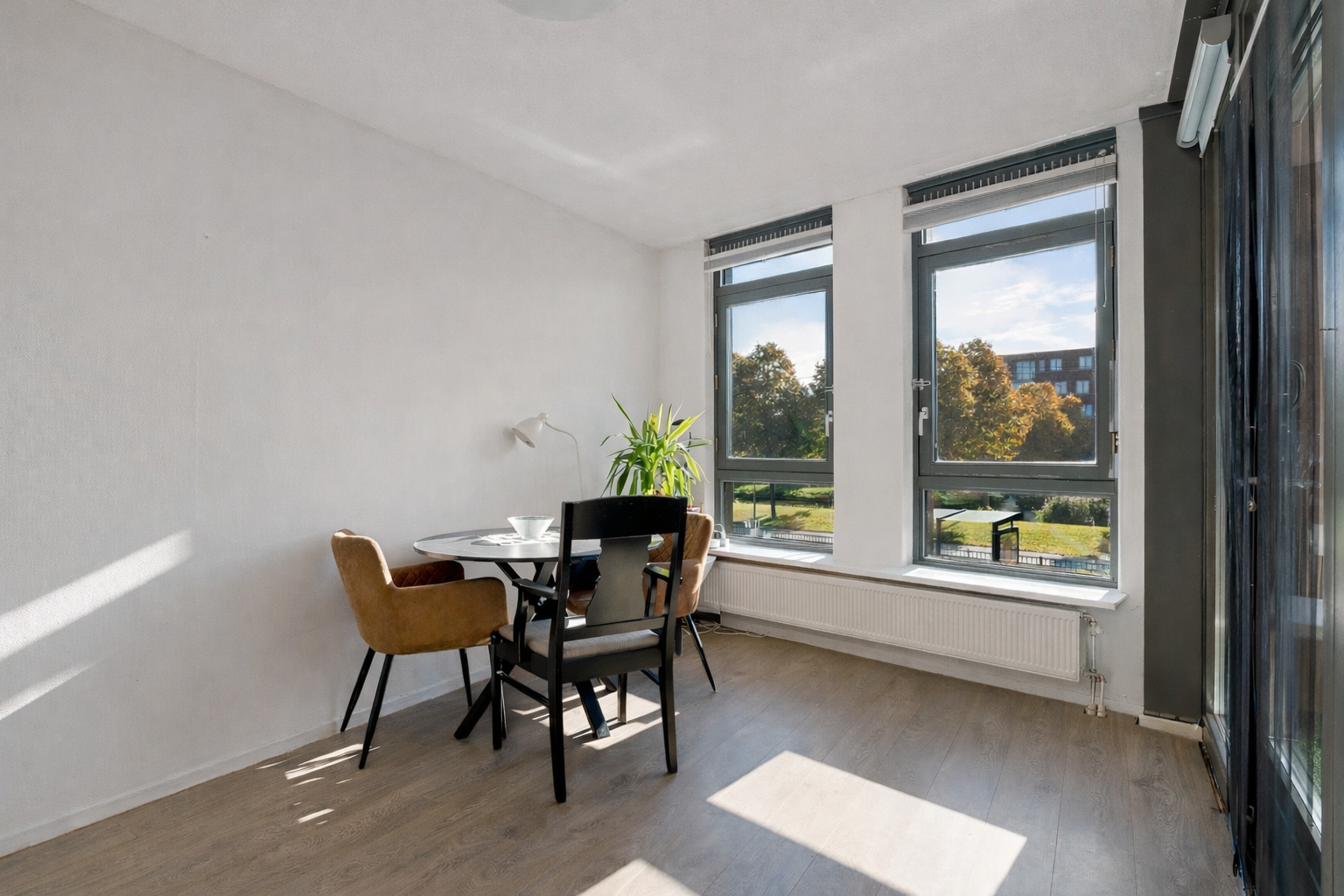 Vanuit de centrale hal van het appartement bereik je alle vertrekken. De woonkamer is ruim opgezet en heeft grote raampartijen die zorgen voor een prettige lichtinval. Vanuit hier stap je direct het balkon op, gelegen op het zuidwesten – perfect om in de middag- en avondzon te ontspannen.