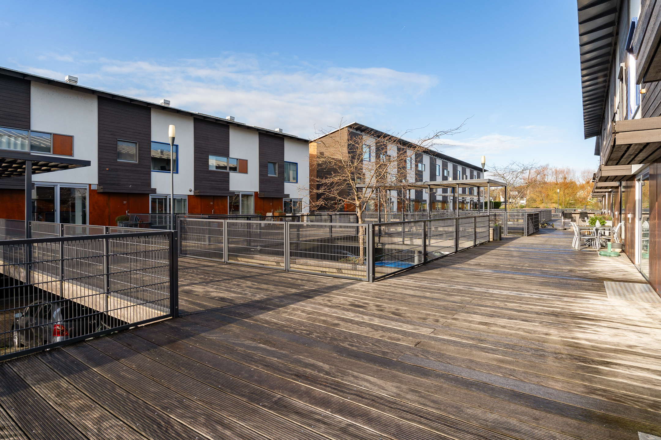 De achtertuin bestaat uit twee niveaus met houten terrassen en twee mooie bomen. Dankzij de ligging aan het water geniet je hier van rust, groen en een vrij uitzicht.