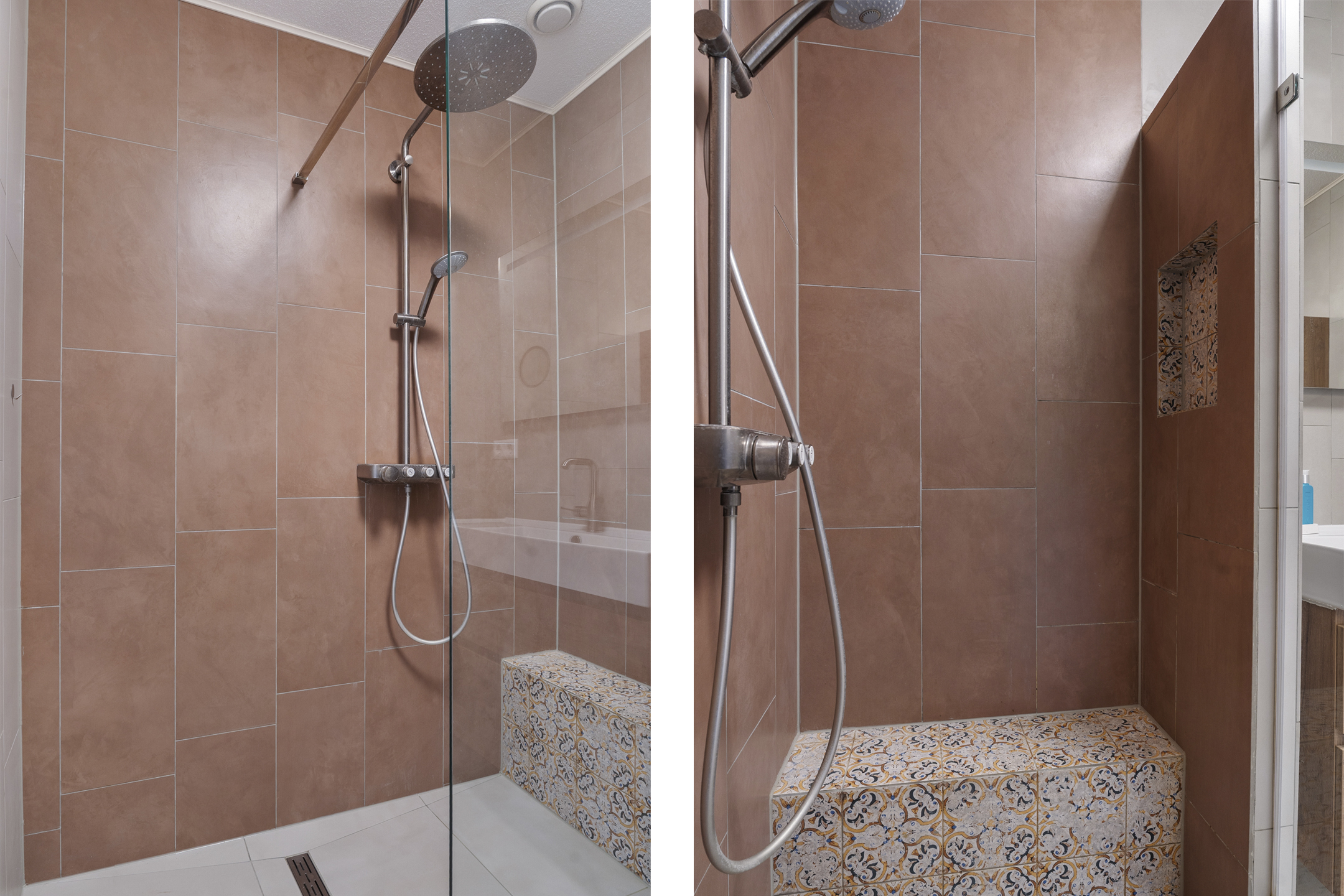 De badkamer is eveneens gerenoveerd en modern afgewerkt met grijs- en bruintinten, mozaïektegels en een sfeervol nisje in dezelfde stijl. De inloopdouche met regendouche en het moderne wastafelmeubel zorgen voor een luxe gevoel. Het separate toilet is netjes betegeld en voorzien van een fonteintje.