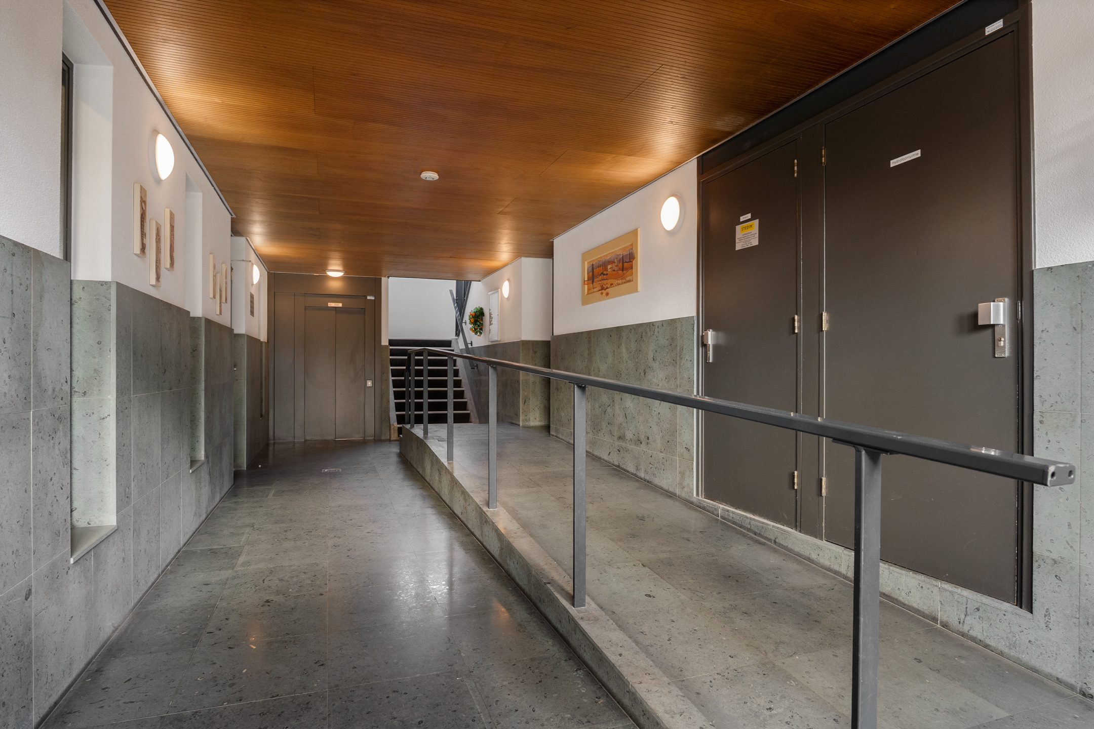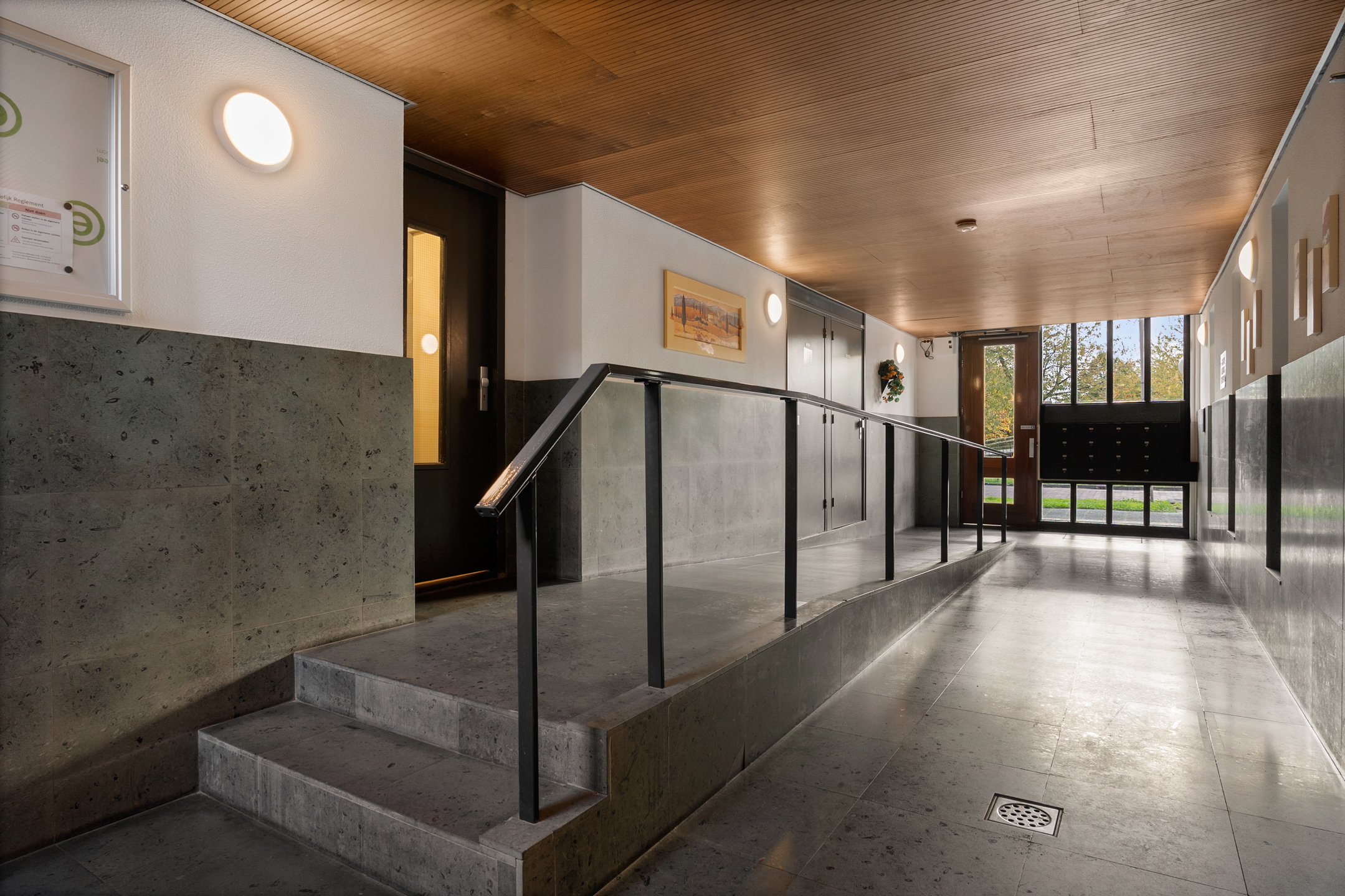 De entree van het gebouw is ruim en verzorgd, voorzien van een luxe afwerking met natuurstenen wand- en vloertegels. Hier vind je het bellentableau, brievenbussen, lift en het trappenhuis naar de verdiepingen.
