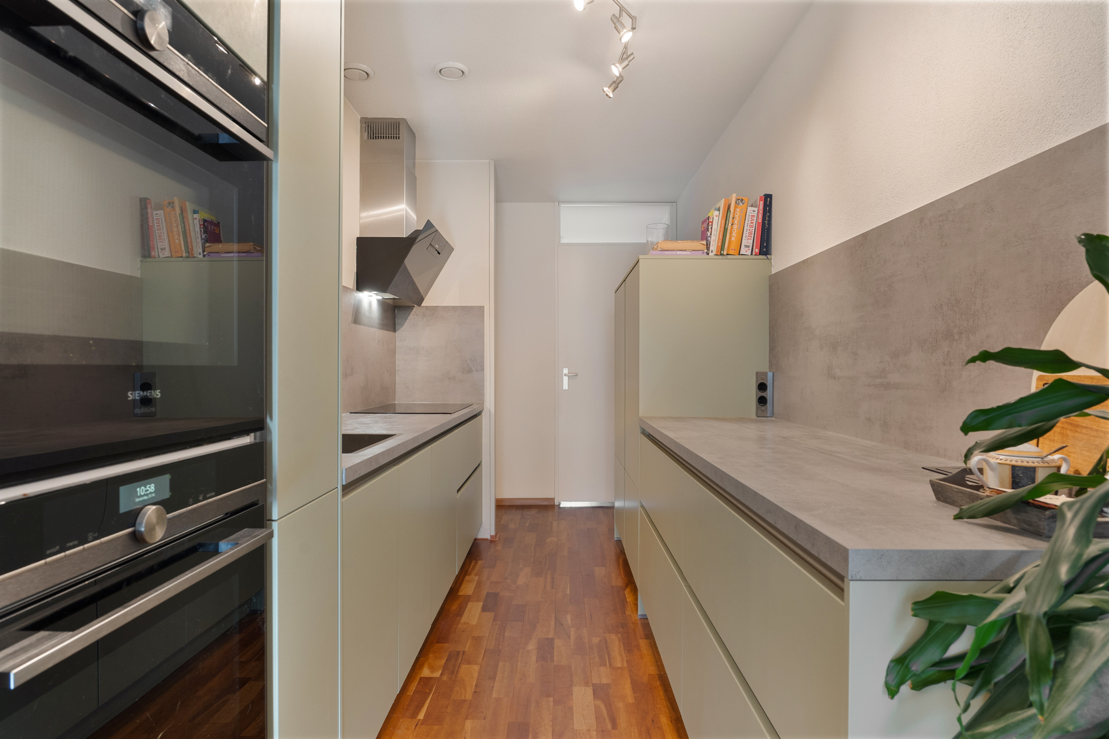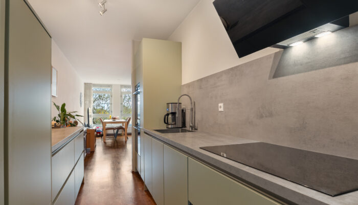 De open keuken is het hart van de woning. Deze is volledig gerenoveerd en valt op door de stijlvolle matgroene greeploze kasten, die zorgen voor een warme en moderne uitstraling. De keuken is voorzien van diverse inbouwapparatuur, en aan de achterzijde bevindt zich nog een extra berging – ideaal voor voorraad of keukenapparatuur.
